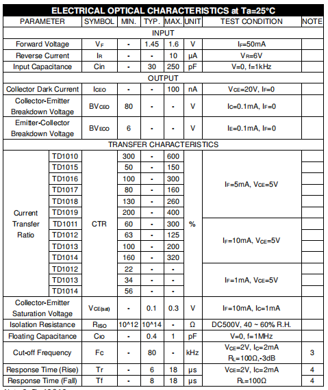 天電TD1019屬于LSOP4光三極管光耦,耐壓5000 VRMS,輸出電壓為80V,輸入正向電流IF50MA,尺寸:7.6*3.6*2.0MM;電流傳輸比CTR值為:200-400%,工作溫度為:-55℃TO 110℃ 在使用性能上能替代東芝TLP10383/TLP383/TLP385,億光EL1019,光寶LTV-1009,兆龍CT1019,瑞薩PS2381-1,威世TCLT1019/VOL617A/VOL618A,仙童FODM100x/FODM819, 主要運(yùn)用于各類型快充,電源反饋電路 系統(tǒng)裝置,測試儀器 寄存器,復(fù)印機(jī),自動(dòng)售貨機(jī) 家用電器,比如風(fēng)扇、熱水器等