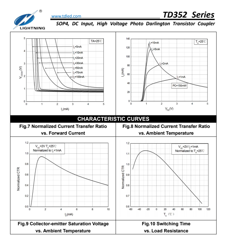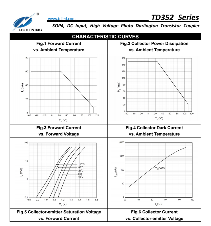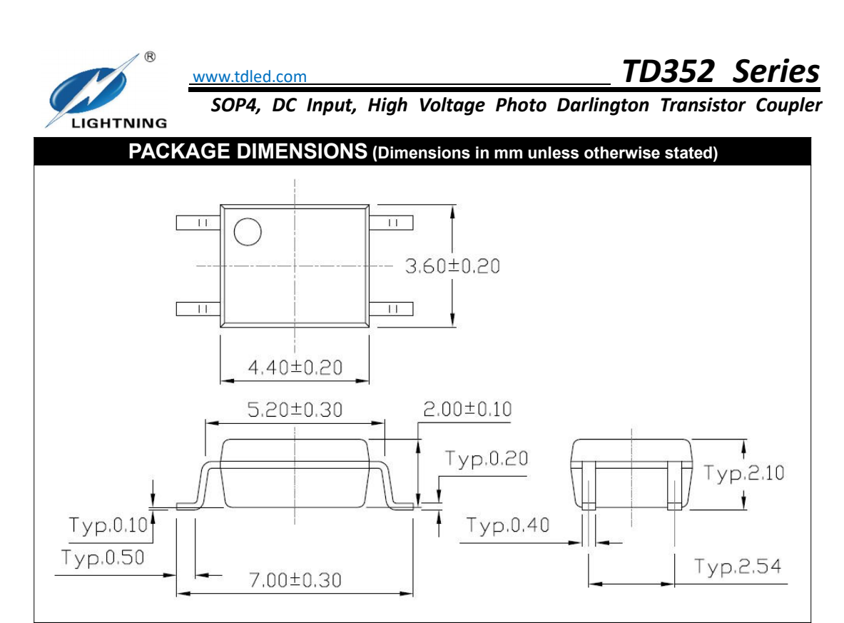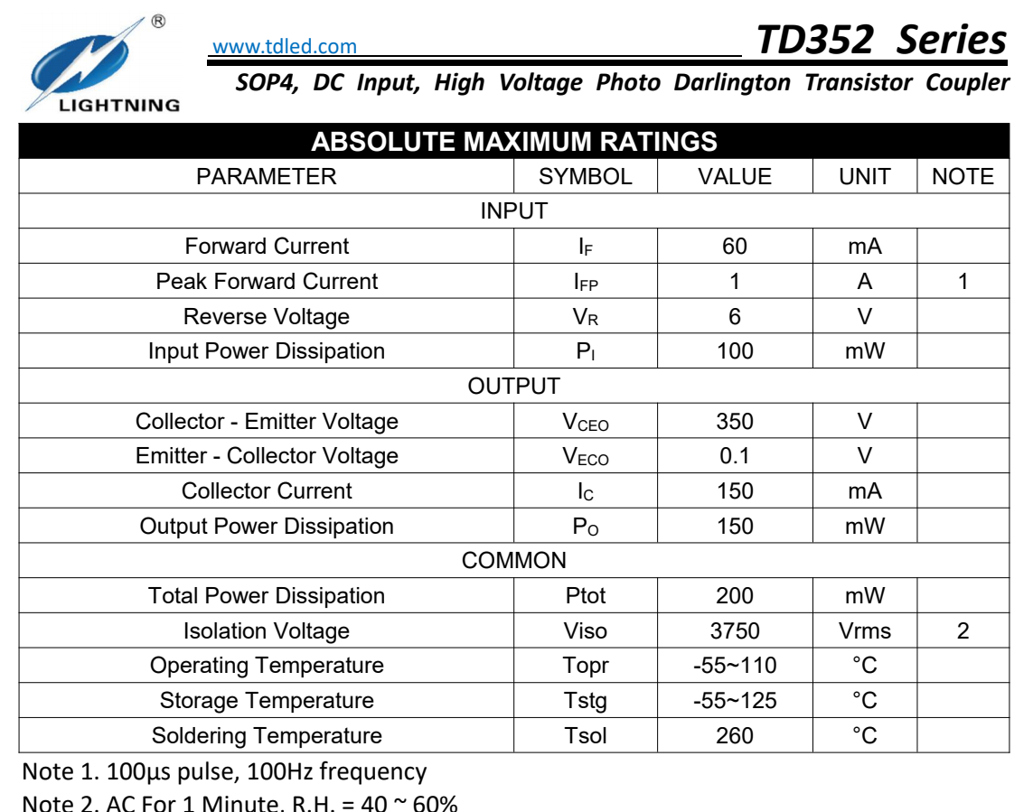 天電TD352屬于SOP4高壓達靈頓管光耦,耐壓3750VRMS,輸出電壓350V,輸入電流IF60MA,尺寸4.4*3.6*2.1MM,工作溫度:-55℃TO 100℃,在使用性能上能替代億光EL452,光寶LTV-352T,兆龍CT452, 夏普PC352/452,東芝TLP187/127,瑞薩PS2732-1/2733-1,仙童FODM352,CTR值為1000-15000%,主要運用于通訊設(shè)備 ,可編程控制器 ,信號傳輸 ,工業(yè)控制,測量儀器;?