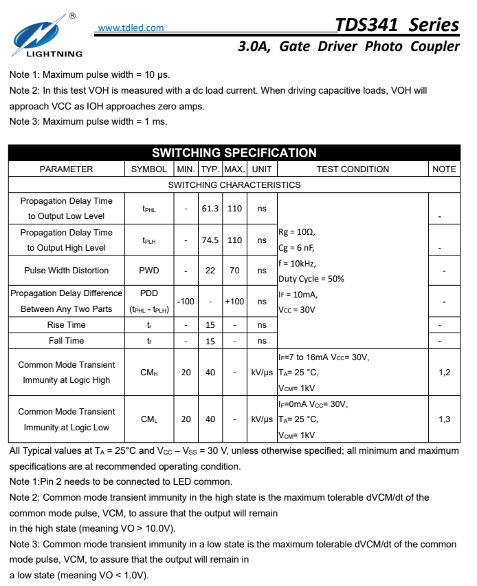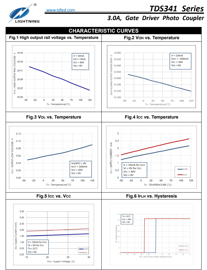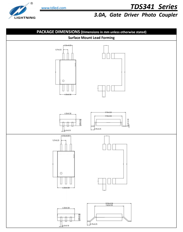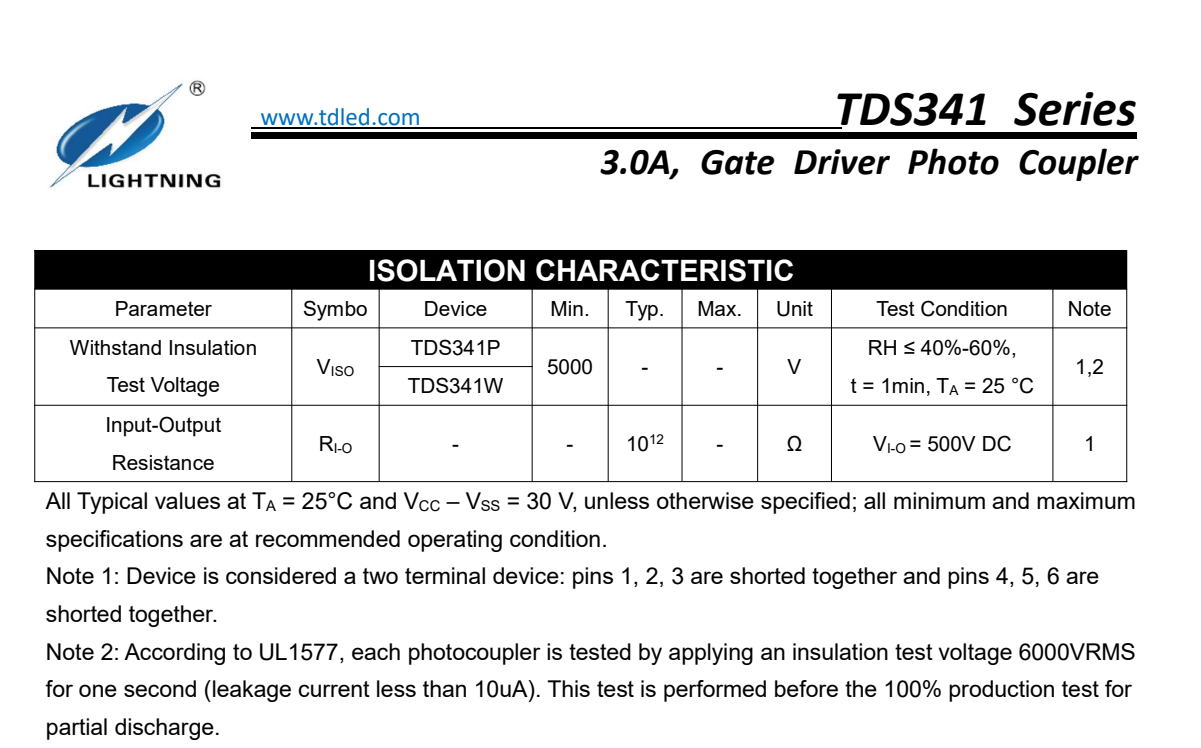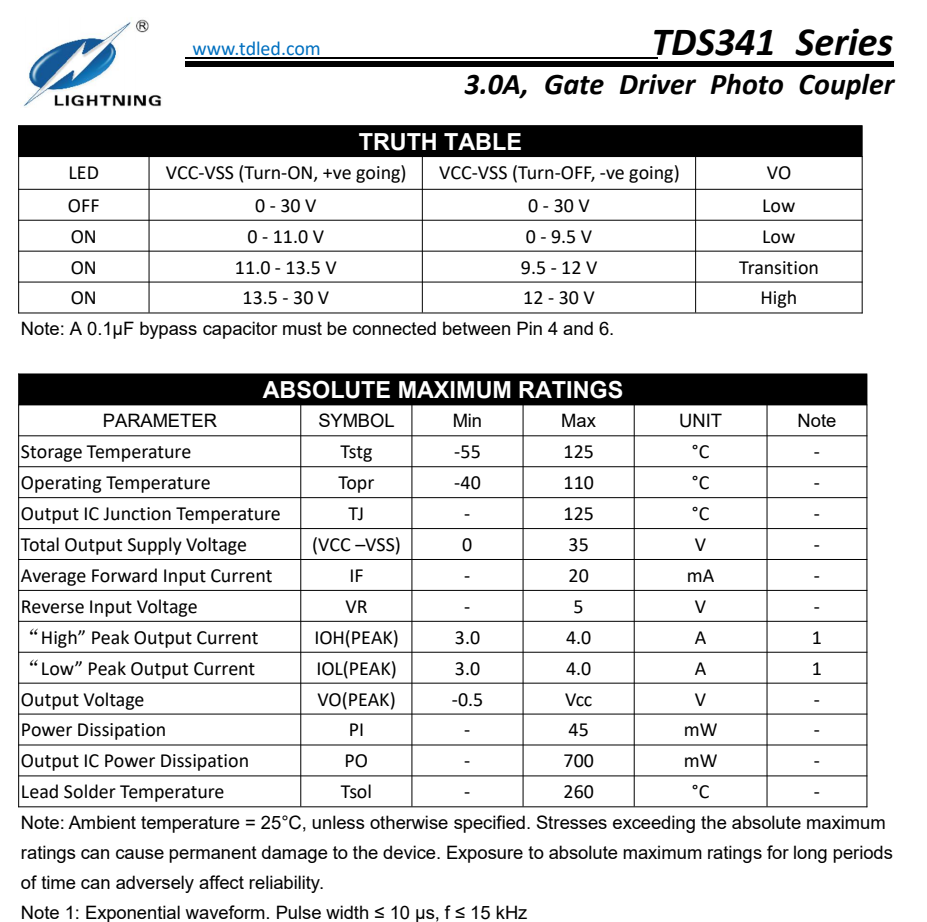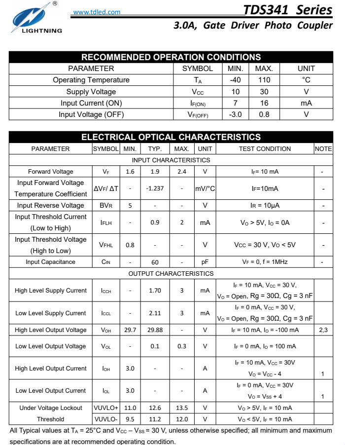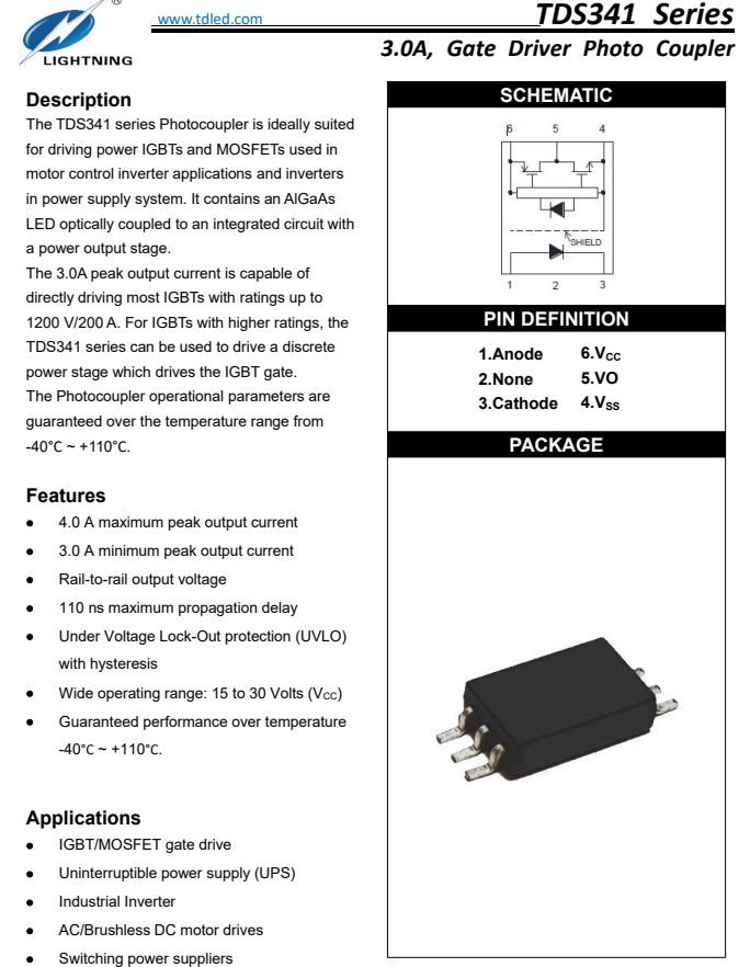 天電TDS341為SOP6 IGBT閘極驅(qū)動光耦,4.0A最大峰值輸出電流,3.0A最小峰值輸出電流,TDS314系列光電耦合器非常適合驅(qū)動用于電機(jī)控制逆變器應(yīng)用和電源系統(tǒng)逆變器的功率IGBT和MOSFET。其包含一個鋁鎵砷化合物(AlGaAs)的發(fā)光二極管組成,通過紅外光耦合到光敏集成電路,該集成電路具有用于推挽 MOSFET 輸出級的高速驅(qū)動器。 3.0A峰值輸出電流能夠直接驅(qū)動額定值高達(dá)1200V/200A的大多數(shù)IGBT。工作參數(shù)在-40°C~+110°C的溫度范圍內(nèi)得到保證,可替代安華高ACPL-P341/ACPL-W341,仙童FOD8342,東芝TLP5772/TLP5754,威世VOL3120,光寶TLV-341,隔離電壓為5000Vrms,電源電壓額定值寬至 10 至30V,廣泛運(yùn)用于開關(guān)電源,IGBT/MOSFET 柵極驅(qū)動,交流和無刷直流電機(jī)驅(qū)動,可再生能源逆變器,工業(yè)逆變器;詳詢羅生:18925289962